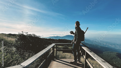 young man Thai boy Asian hipster men backpacker enjoying on beautiful landscape scenery view jungle mountains forest at Kew Mae Pan Nature Trail Doi Inthanon National Park, Chiang Mai, Thailand.