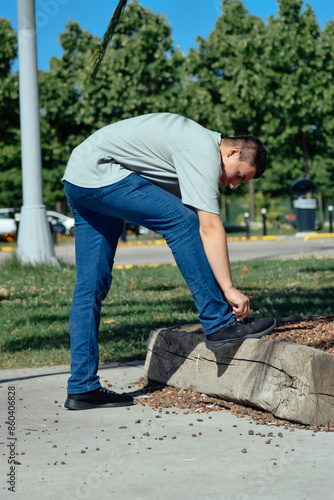Young man tying his shoelaces on the street