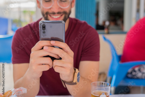adult, attractive, bar, beard, beauty, boy, cafeteria, casual attire, caucasian, city, communication, confidence, connection, expression, gesture, goggles, happy, holding, holiday, cyberspace, leisure, lifestyle, looking, male, man, message, mobile, modern, 1, people, person, phone, eatery, screen, sitting, smart, smartphone, smiling, student, summer, table, talking, technology, phone, touch, tour tourism, travel, using, vacation, young
