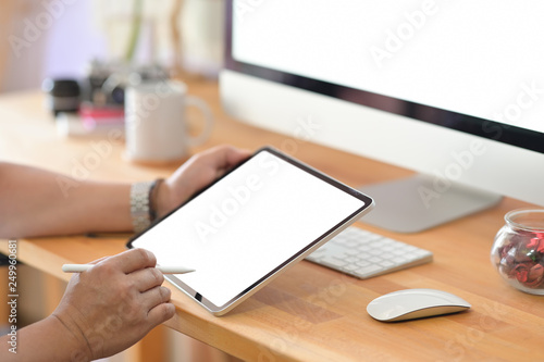 cyberspace, screen, communication, blank, computer, technology, digital, device, white, display, mock, tablet, black, business, empty, people, mobile, person, background, space, hand, office, over, woman, wireless, young, touch, touch screen, using, lifestyle, pad, female, holding, hot drink, desk, desktop, keyboard, male, man, notebook, crayons, table, up, view, work, workplace