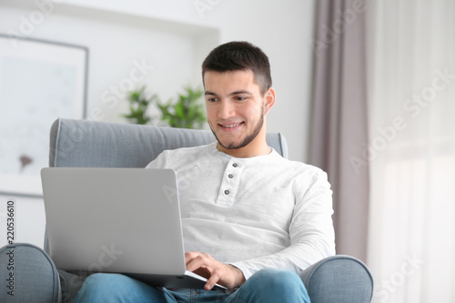 Young man using modern laptop at home