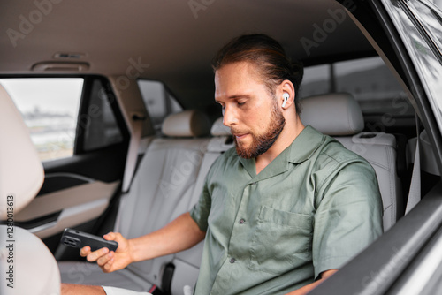 man, smartphone, car, technology, lifestyle, communication, style, casual attire, urban, transport, day, sitting, music, earbud, interior, vehicle, modern, sharpened, expression, relaxation, travel, comfort, fashion, mobile, earphones, stylish, modernity, connection, happiness, concentration, passenger, leisure, privacy, enjoyment, urbanism, contemporary, transportation, design, ambience, light