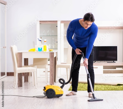 Young man vacuum cleaning his apartment