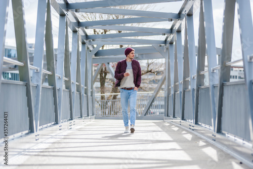 young, man, walking, bridge, earbud, smartphone, technology, copy space, 1, people, communication, adult, student, jacket, mobile, phone, holding, hearing, purple, leisure, style, lifestyle, urban, connection, music, outdoors, footbridge, accessibility, wireless, listening, woolly, hat, fashionable, steel, structure, earphones, looking, streaming, caucasian, german, colours, city, cap, earphones, male