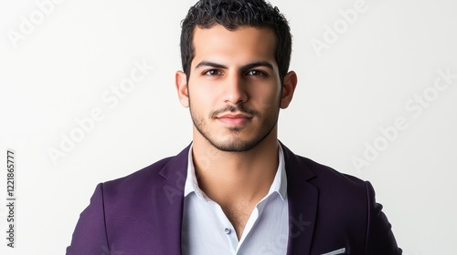 man, male, person, human, young, adult, photogenic, attractive, face, feature, eye, brown, hair, dark, short, curly, beard, stubble field, goatee, moustache, complexion, skin, tan, olive, suit, blazer, purple, jacket, clothing, attire, fashion, style, formal, professional, shirt, white, collar, buttons, chest, model, portrait, studio, background, clean, simple, expression, neutral, serious