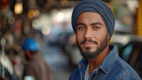 man, turban, market, street, vibrant, culture, community, smiling, confidence, bustling, background, people, atmosphere, diversity, activity, lifestyle, portrait, urban, style, expression, young, engagement, cheerful, joy, clothing, interaction, warmth, light, structure, casual attire, beard, landscape, high-coloured, environment, tradition, heritage, ethnicity, connection, business, commerce, beauty, generative, ai
