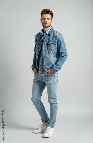 denim, jean, jacket, shirt, blue, young, man, model, style, fashion, grey, stylish, trendy, clothes, jean, footwear, outfit, photogenic, posing, shoe, sneaker, fashionable, copy space, one person, studio shot, full-length, casual attire, male, caucasian, modern, urban, photogenic, beard, coiffure, confident, portrait, attractive, guy, person, apparel, clothing, lifestyle, everyday, wear, white, sneaker, hand, pocket
