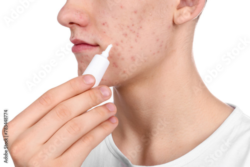 Young man with acne problem applying cosmetic product onto his skin on white background, closeup