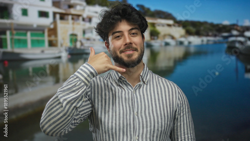 Young man with beard gesturing phone call at a scenic port with ships and boats in the background, showcasing a relaxed atmosphere.