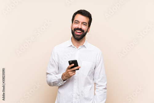 Young man with beard holding a mobile laughing
