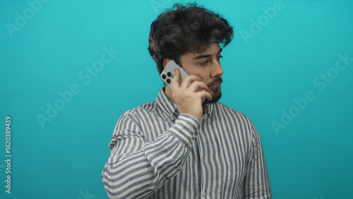 Young man with beard talking on smartphone against blue background wearing casual striped shirt looking thoughtful and focused on a call.