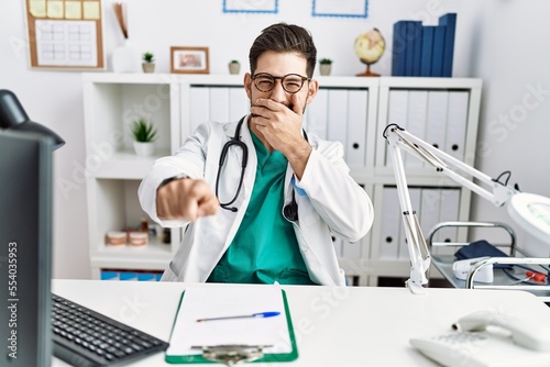Young man with beard wearing doctor uniform and stethoscope at the clinic laughing at you, pointing finger to the camera with hand over mouth, shame expression