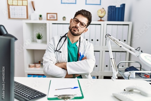 Young man with beard wearing doctor uniform and stethoscope at the clinic skeptic and nervous, disapproving expression on face with crossed arms. negative person.