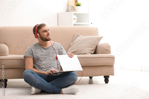 Young man with headphones and laptop sitting on floor in living room