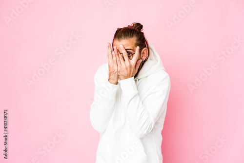 Young man with long hair look blink through fingers frightened and nervous.
