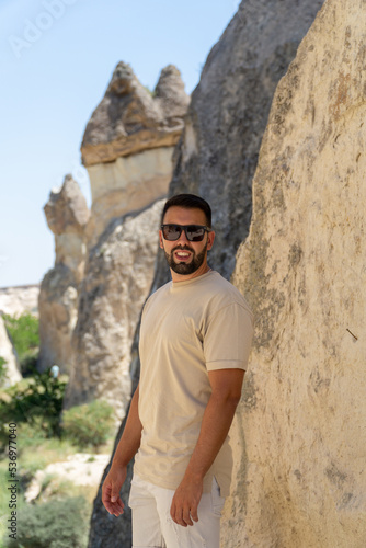 Young man with sunglasses visiting pasabag valley with typical rock formations of the cappadocia area in turkey