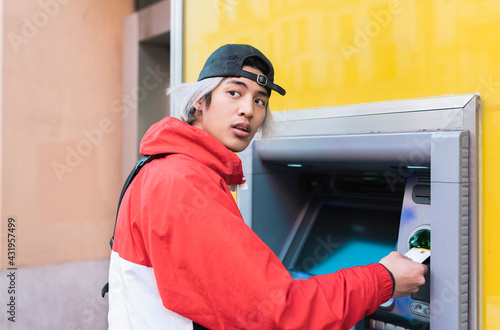 young, man, money, atm, machine, 1, people, adult, male, outdoors, day, spain, jacket, credit, card, cashless, banking, finance, cash, convenience, cap, white hair, accessibility, holding, lifestyle, looking, long hair, hair, warm, clothing, hipster, asian, ethnicity
