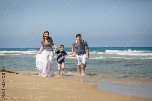 Young man, woman, kid on sea vacation. Family funny run on a tropical beach at sunny day, enjoying summer holidays. Summer lifestyle portrait of pretty family: mom, dad, son. Travel in tropic country