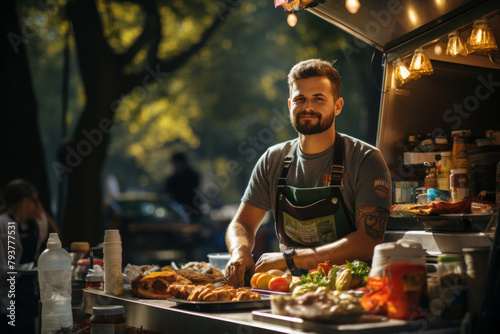 caucasian, man, food, truck, business, fast, van, cook, street, market, service, commercial, take-away, take-out, apron, owner, culinary, eat, cut, preparing, receipe, take, kiosk, epicure, away, meal, cookery, person, industry, kitchen, lifestyle, chef, eatery, vegetable, catering, modern, shop, organic, retail, menu, fries, fresh, uniform, snack, job, adult, young, frying pan