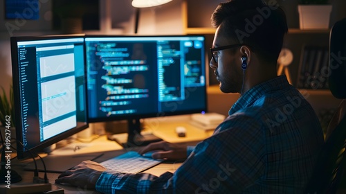 man, desk, computer, working, night, screen, code, programming, typing, keyboard, mouse, monitor, goggles, beard, focused, dark, room, light, blue, plaid, shirt, earphones, earphones, technology, developer, programmer, digital, business, office, work, male, young, adult, caucasian, professional, laptop, hot drink, sleepy, deadline, project