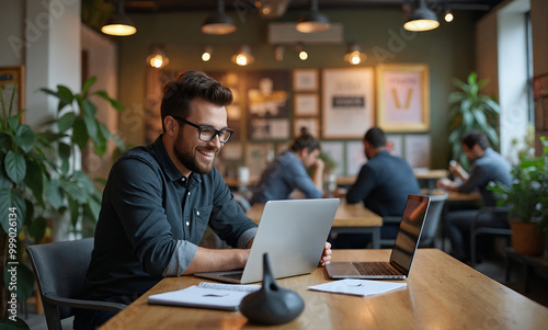 laptop, workspace, young, man, smiling, productivity, urban, modern, plant, technology, professional, casual attire, indoor, decor, furniture, creative, office, collaboration, design, teamwork, inspiration, communication, digital, century, contemporary, networking, space, hot drink, focused, concentration, style, community, atmosphere, learning, culture, meeting, business, relaxed, innovation, remote, working, connectivity, engagement, growth, brainstorming, environment