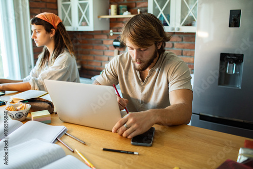 people, man, working, caucasian, white, laptop, young, kitchen, cosy, morning, study, indoor, adult, technology, digital, focused, casual attire, home, work, learning, remote, occupation, education, communication, relaxing, modern, concentration, professional, activity, productivity, lifestyle, comfortable, contemporary, innovation, task, office, home office, freelance, project, cognition, efficiency, emotion, thoughtful, male, lifestyle, copy space