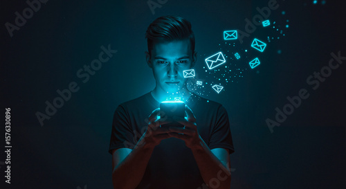 smartphone, electronic mail, letter, mail, message, envelope, communication, phone, business, businessman, contact, mobile, background, technology, man, network, screen, social, cyberspace, global, connection, icon, phone, touch, symbol, digital, web, virtual, earth, hand, electronic mail, concept, flying, dark, blue, black, neon, glow, young, online, marketing, aglow, modern, contemporary, smart, display, cyberspace