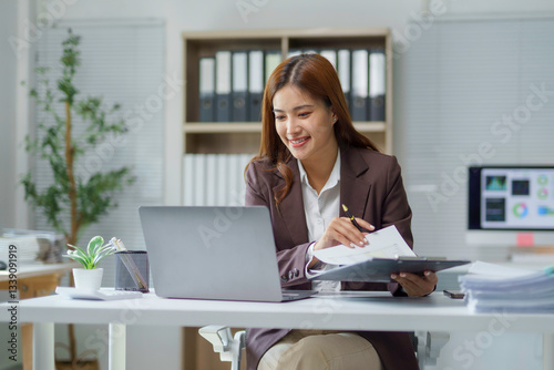 Young manager analyzing paperwork and working on laptop, sitting at her desk in modern office