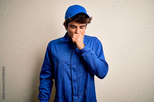 Young mechanic man wearing blue cap and uniform standing over isolated white background feeling unwell and coughing as symptom for cold or bronchitis. Health care concept.