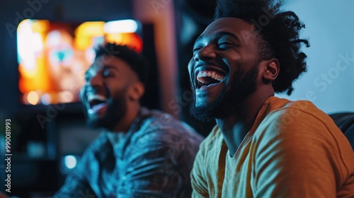 Young men laughing while watching a comedy show on TV.