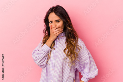 Young mexican woman isolated on pink background covering mouth with hands looking worried.