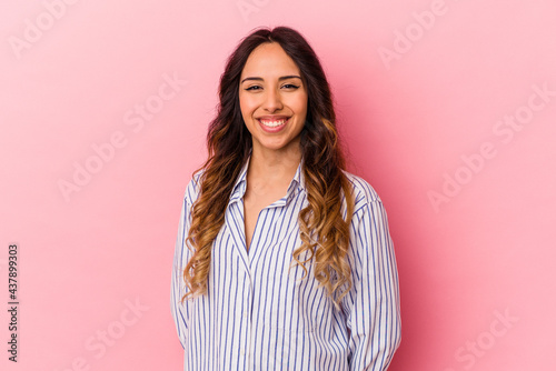 Young mexican woman isolated on pink background happy, smiling and cheerful.