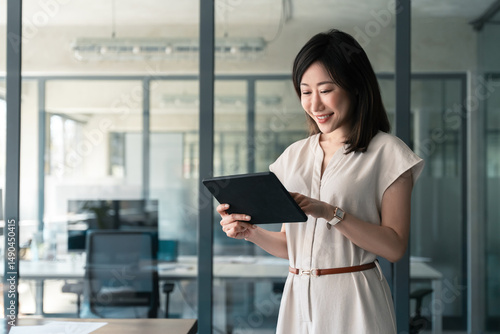 Young middle-aged manager businesswoman using tablet pc application for online work in office. Asian woman banker holding digital pad tab computer, working on financial banking report. Copy space