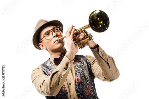 young mixed race man in stylish hat and eyeglasses playing on trumpet isolated on white