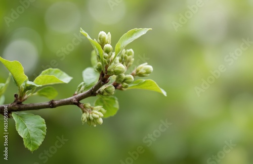 Young mock bush branch with blossoming green leaves and buds. Soft spring background with bokeh. Plenty of copy space for text, design projects, springtime announcements.