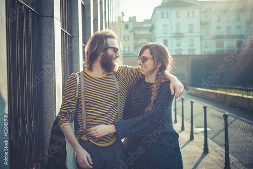 pair, unusual, hipster, modern, walking, city, urban, spring, having fun, hugging, embracing, smiling, happiness, lifestyle, future, sunglasses, sunshine, serenity, 2, diversity, diverse, authentic, people, female, male, caucasian, young, girlfriend, boyfriend, love, lover, beard, bearded, blond, long, fun, togetherness, human relationships, red