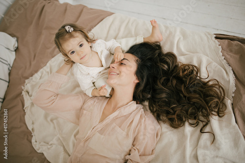 Young mother and her little daughter having fun in a bedroom, they playing, laughing and hugging. Happy family concept.