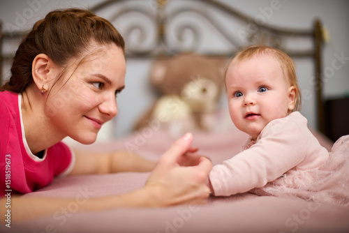 missy, baby girl, mother, bonding, brown hair, blonde hair, joy, warmth, indoor, closeup, family, affection, tenderness, love, expression, daughter, happy, smiling, parenting, childhood, maternity, togetherness, infant, care, nurturing, portrait, soft light, cosy, intimate, connection, comfort, playful, relaxed, peaceful, domestic, home, serene, gentle, endearing, sweet, heartwarming, hugs, closeness, oneness, delightful