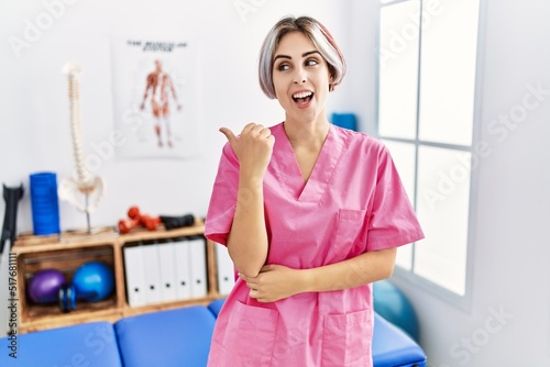 Young nurse woman working at pain recovery clinic smiling with happy face looking and pointing to the side with thumb up.