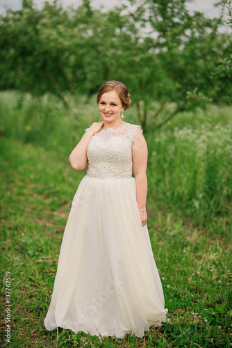Young overweight girl at beige dress posed background spring garden.