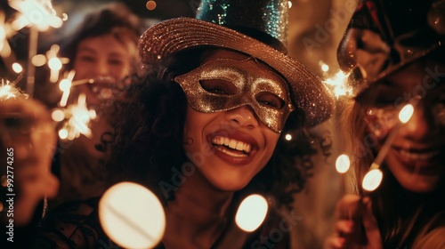 party, masquerade, woman, mask, new year, christmas, friends, new year's eve, sparkler, fireworks, costume, celebration, festive, night, happy, fun, joy, togetherness, friendship, mask, hat, light, bokeh, nightlife, event, december, winter, holiday, countdown, midnight, cheer, smiling, laughing, excitement, anticipation, magic, memory, portrait, group, young adult, social gathering, indoor, glowing, vibrant, colourful, happy new year, cheerful