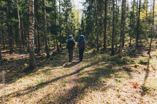 caucasian, young men, journey, nature, outdoors, sweden, travel, adventure, backpacking, backpack, hiker, together, bonding, togetherness, tree, backview, couple, trust, forest, walking, trecking, people, adult, young adult, scandinavia, hiking, plant, pair, 2, woman, female, man, male, young, adult