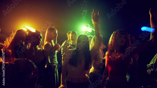 Young people, men and women gathering together, attending concert, party, cheerfully dancing and having good time. Concept of youth culture, party, fun and leisure