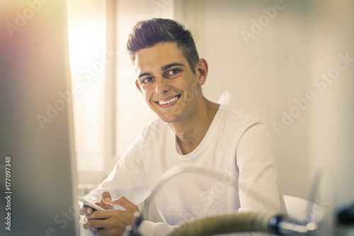 computer, student, office, home, working, desktop, typing, mobile, mobile phone, phone, cellular, chat, blog, seated, portrait, technology, notebook, laptop, exam, interior, room, online, cyberspace, search, network, social, media, connected, screen, concept, intelligent, youth, boy, casual attire, modern, smiling, photogenic, attractive, hipster, exploitation, photogenic, latino, teenage, adult, man, lifestyle, face, human