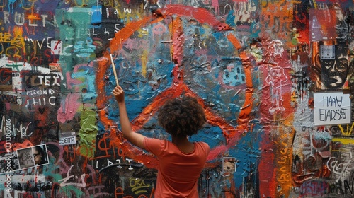 Young person paints a large peace sign on a colorful graffiti-covered wall, symbolizing the desire for peace and artistic expression.