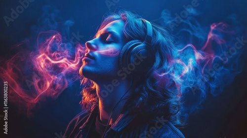 earphones, music, smoke, person, young, woman, man, hair, long, face, eye, closed, colourful, blue, red, pink, purple, light, dark, background, studio, portrait, listening, audio, sound, vibe, feeling, emotion, relax, peaceful, calm, dreamy, mysterious, artistic, creative, style, fashion, cool, trend, art, image, photo, visual, concept, mood, atmosphere, expression
