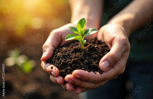 Young plant growing in soil held gently in hands on sunny day