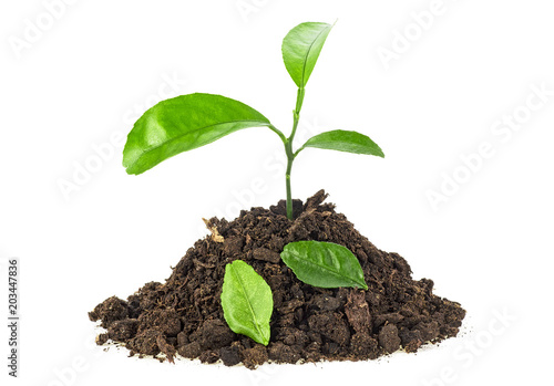 Young plant in soil with fallen leaves on white background