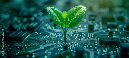 young plants grow from circuit boards. Green Computing, Green Technology, Green IT, csr, and IT ethics Concept. Green Technology Banner