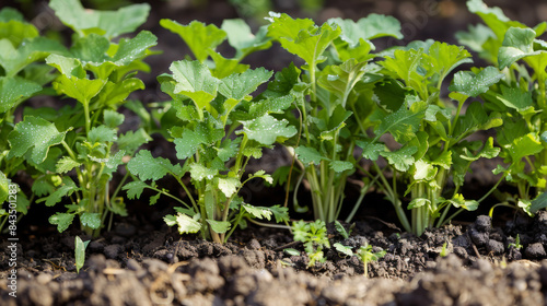 Young plants sprout vibrantly from the rich, dark soil in a garden bed, capturing the essence of growth and new beginnings.